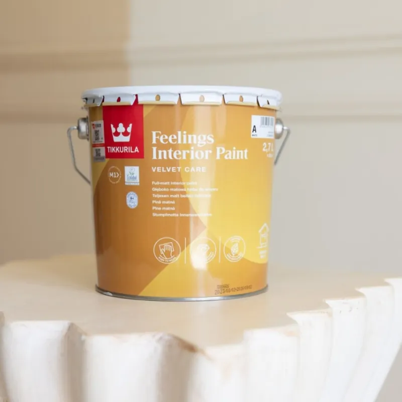 The low-odour Feelings Interior Paint formula has very low VOC-emission level. This is proved by M1 and EU Ecolabel certificates.