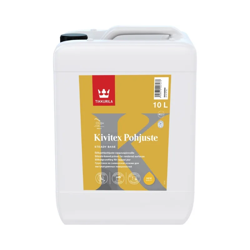 Kivitex Pohjuste strengthens rendered surfaces, it is an excellent primer for priming concrete, lime, lime cement, cement plaster and sand-lime brick surfaces. In order to improve the adhesion of the paint to the surface, use Kivitex Pohjuste as a bonding layer for priming porous, water-absorbing masonry surfaces before painting with silicate paint.