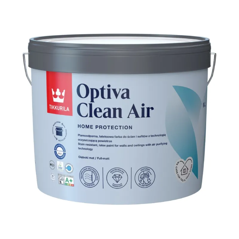 AIR PURIFYING TECNOLOGY 1. Optiva Clean Air contains innovative technology binder with Formaldehyde abatement properties. 2. Paint reduces indoor air formaldehyde concentration, which is proved by tests performed by accredited independent laboratory (accoridng to ISO 16000:23). EXTREME DURABILITY 1. Increased stain and dirt resistance* 2. A homogeneous and easy to paint 3. The final effect with uniform gloss 4. No gloss change after cleaning 5. Durability of colour in long period of time 6. Innovative tinting system Avatint WASH RESISTANT 1. Highest wet scrub resistance - class 1 (EN 13300) FRIENDLY FOR HEALTH AND ENVIRONMENT 1. Highest quality confirmed with EU Ecolabel certificate. 2. Recommendation from Polish Society of Allergology (PTA)** 3. Raw materials used in paint production according to European parliament decree REACH, which aim is to assure high level of health and environment protection. 4. Paint is certified with Eurofins Air Comfort Gold which shows compliance with all relevant VOC-related emission requirements in Europe (governmental and voluntary). Indoor Air Comfort Gold certificates are directly accepted as proof from programs for sustainable buildings like BREEAM international and LEED in the term of emission. 5. Paint fulfils the VOC requirement in BREEAM International System 2016 for New Construction for exemplary level ***. 6. Product fulfils the emission VOC requirement of LEED v4LEED v4.1 for INTERIOR DESIGN AND CONSTRUCTION „EQ Credit: Low Emitting Materials” both in range of content of volatile organic compound as well as in range of emission from the surface according to method accepted for investments realized outside USA. 7. A+ class on account of low emission from the coat according to French VOC Regulation norms. 8. Paint fulfils the emission requirements established by German Institute Building Technique (DIBt) and German Committee for health appraise of building materials (AgBB 2021), and also fulfils requirement found in Belgian royal decree established the emission limits for buildings materials for interior use (2014). 9. Partly recycled packaging EASY APPLICATION 1. Non-dripping formula. 2. Very good adhesion to the surface. 3. Easy spread of paint. 4. Optimal drying time. * It is recommended to remove stains no later than 15 minutes after staining. ** The recommendation of the Polish Society of Allergology applies to fully dried surface and well ventilated room. *** Acquaint Yourself with details in Producer Declaration concerning BREEAM International system.