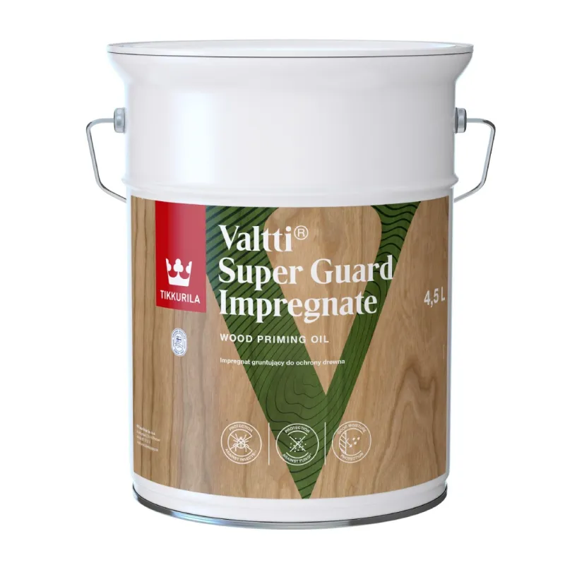 Valtti Super Guard Impregnate is a solventborne agent for exterior wood protection fungus Basidiomycota which decompose wood and blue stain fungus and insects technical wood vermin. Used for wood which doesn’t have contact with soil or surface water and ground water. Product can be used only for wood designed for use in 2nd and 3rd class of use which is for exterior use. Do not use for wood which have a direct contact with food or feed for animals or long contact with skin. Product recommended as a primer for following top coat products: Tikkurila Valtti Color Extra, Tikkurila Valtti Color New, Tikkurila Valtti Expert, Tikkurila Unica Super Lacquer, Tikkurila Everal Matt [10], Tikkurila Everal Semi Matt [30], Tikkurila Everal Semi Gloss [70], Tikkurila Everal High Gloss [90], Tikkurila Everal Aqua Semi Matt [40], Tikkurila Everal White Matt [10], Tikkurila Everal White Semi Matt [30], Tikkurila Everal White Semi Gloss [70].