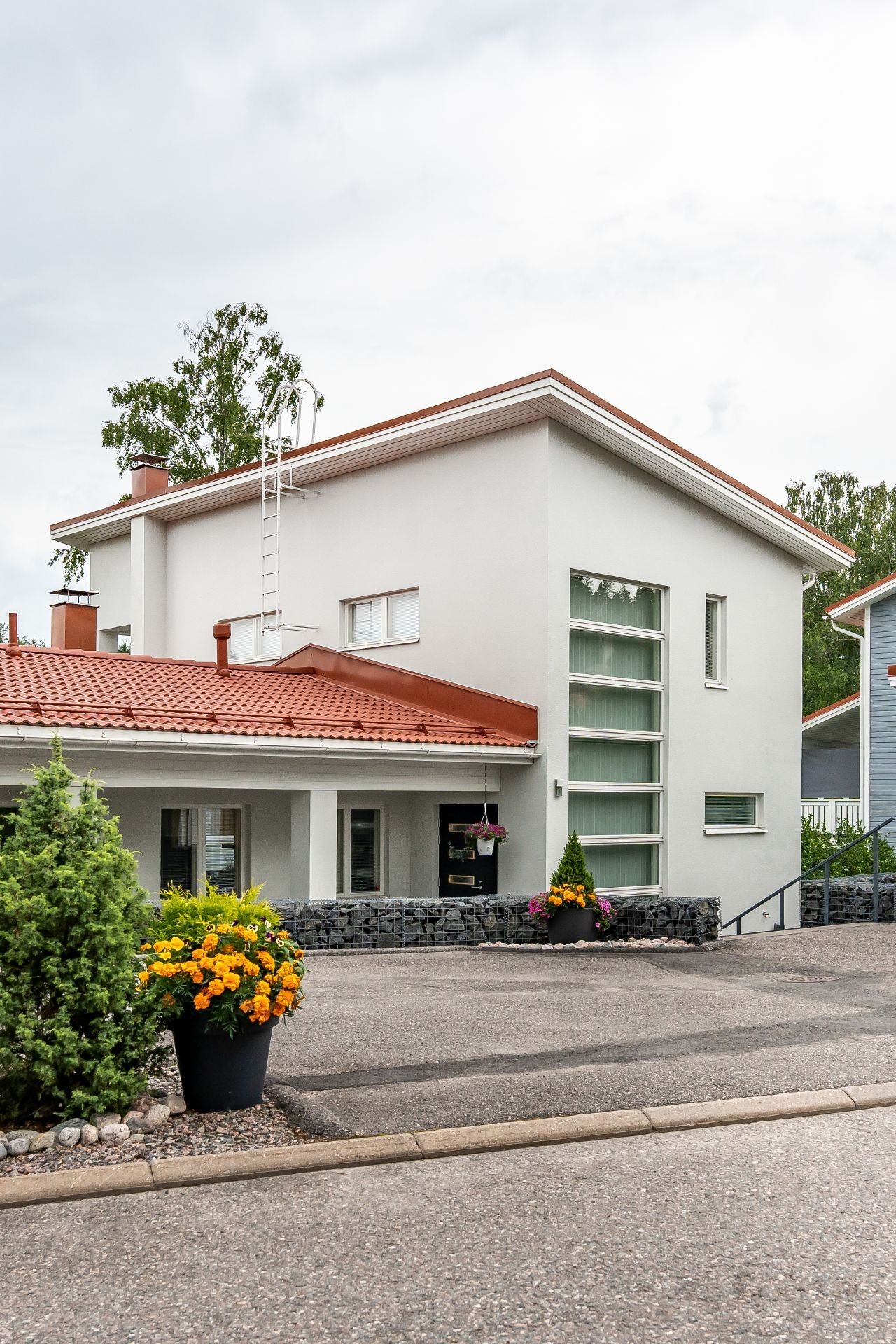 Façade painting: Tikkurila Finngard Clean-julkisivumaali, a waterborne, silicone resin paint with a highly hydrophobic surface that repels soil and water, keeping the structure clean and dry, even in extreme weather conditions. Facade colour: Q824. Plinth colour: Q859.