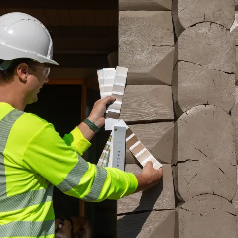 When the house was built, it was painted with a Tikkurila wood stain in a brown-orange shade. It was time to renovate the façade, but I faced two challenges: first, choosing the most suitable and durable coating for log houses; and second, selecting a colour that would blend in with the landscape as the house sits on a hill, visible from afar. The new colour also needed to complement our friends' house next door, which is coated with Tikkurila paint in a dark shade.