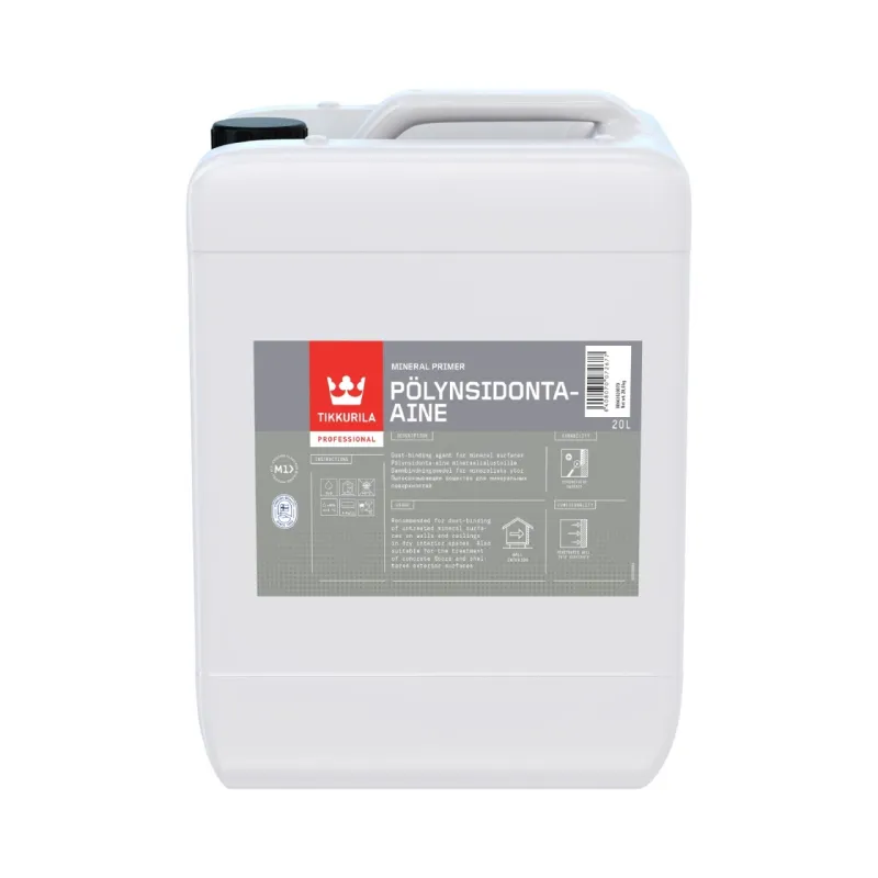 Pölynsidonta-aine (Dust-Binding Agent) is suitable for wall and ceiling surfaces as well as concrete floors in dry interior spaces. It is also suitable for exterior spaces sheltered from weathering. Pölynsidonta-aine is suitable for concrete, plaster, filler, and tile surfaces as well as the most common mineral plate types.