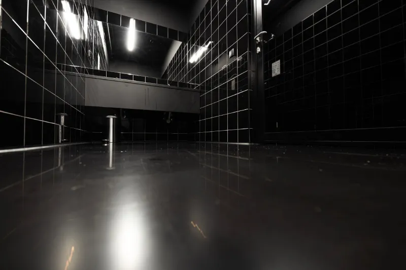 In spaces such as changing rooms and bathrooms, a two-component polyurethane coating was used – Tikkurila Temafloor PU Color in black RAL 9005.